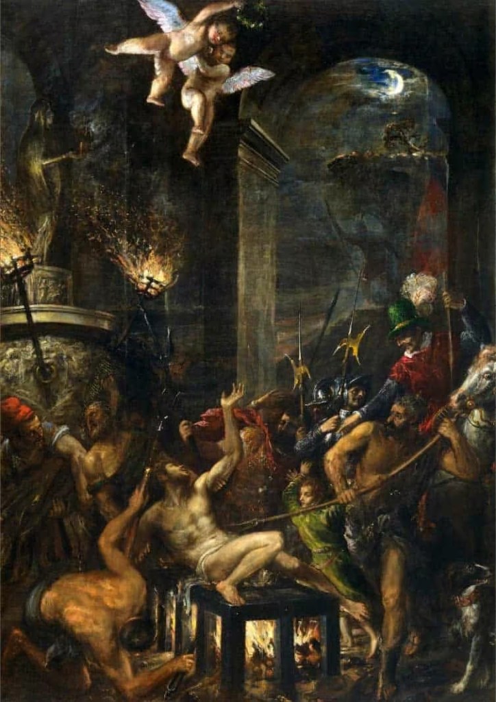 También dice la historia que fue cocinado a fuego lento y que en un “alarde de humor” y de valor, San Lorenzo dijo en un momento dado: -“¡Dadme la vuelta! Ya estoy asado de este lado”. (Y aquí el motivo por el que quizás, también sea el patrón de los payasos, los comediantes y escritores de comedia). Tras su muerte, se cuenta que el cielo se llenó de estrellas fugaces. (En la imagen del cuadro “El martirio de San Lorenzo” -bajo este párrafo- de Juan Correa de Vivar, pintado en el segundo tercio del siglo XVI, se aprecia en la esquina superior derecha, el detalle de las lágrimas de San Lorenzo mientras estaba siendo torturado).